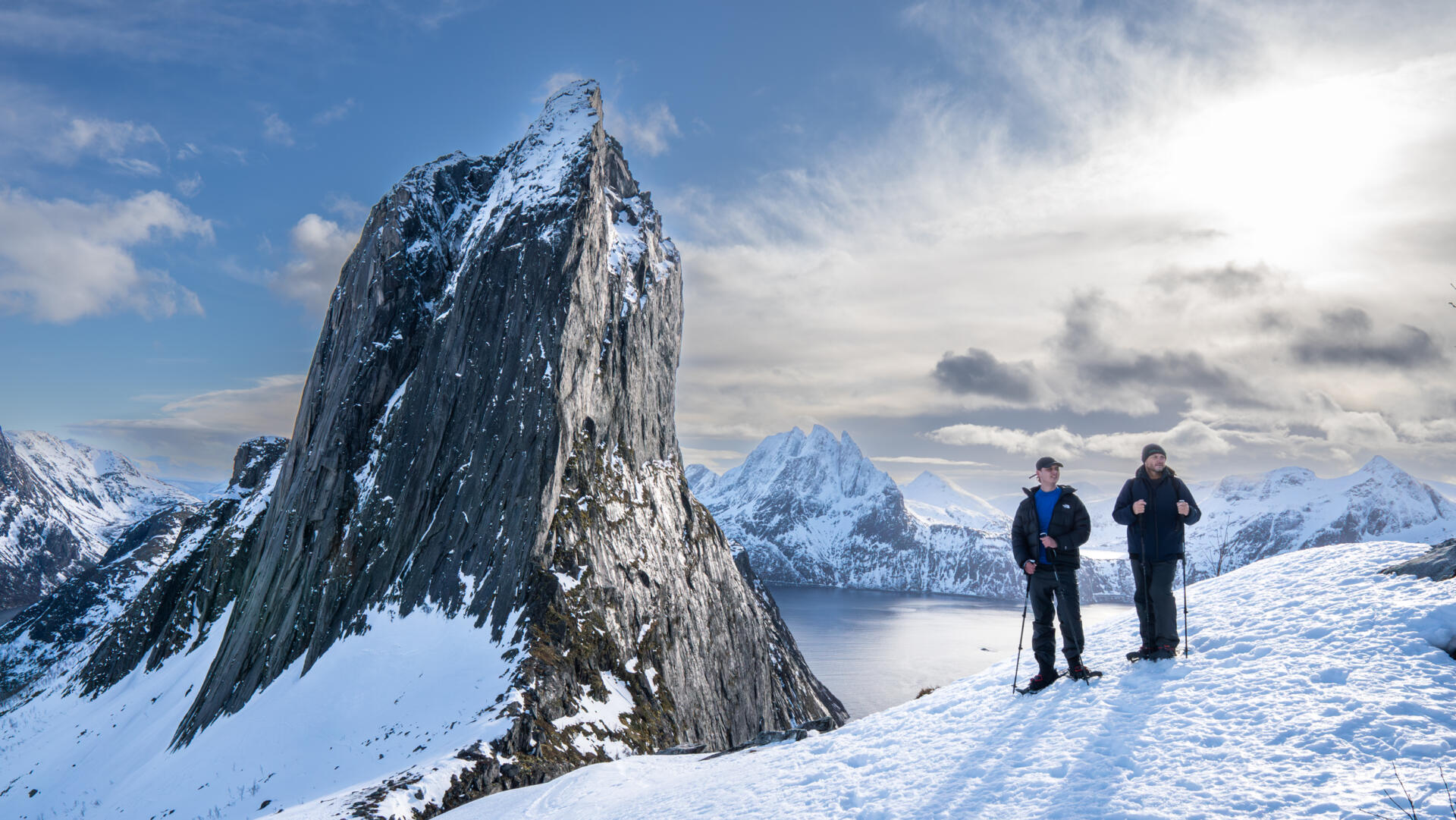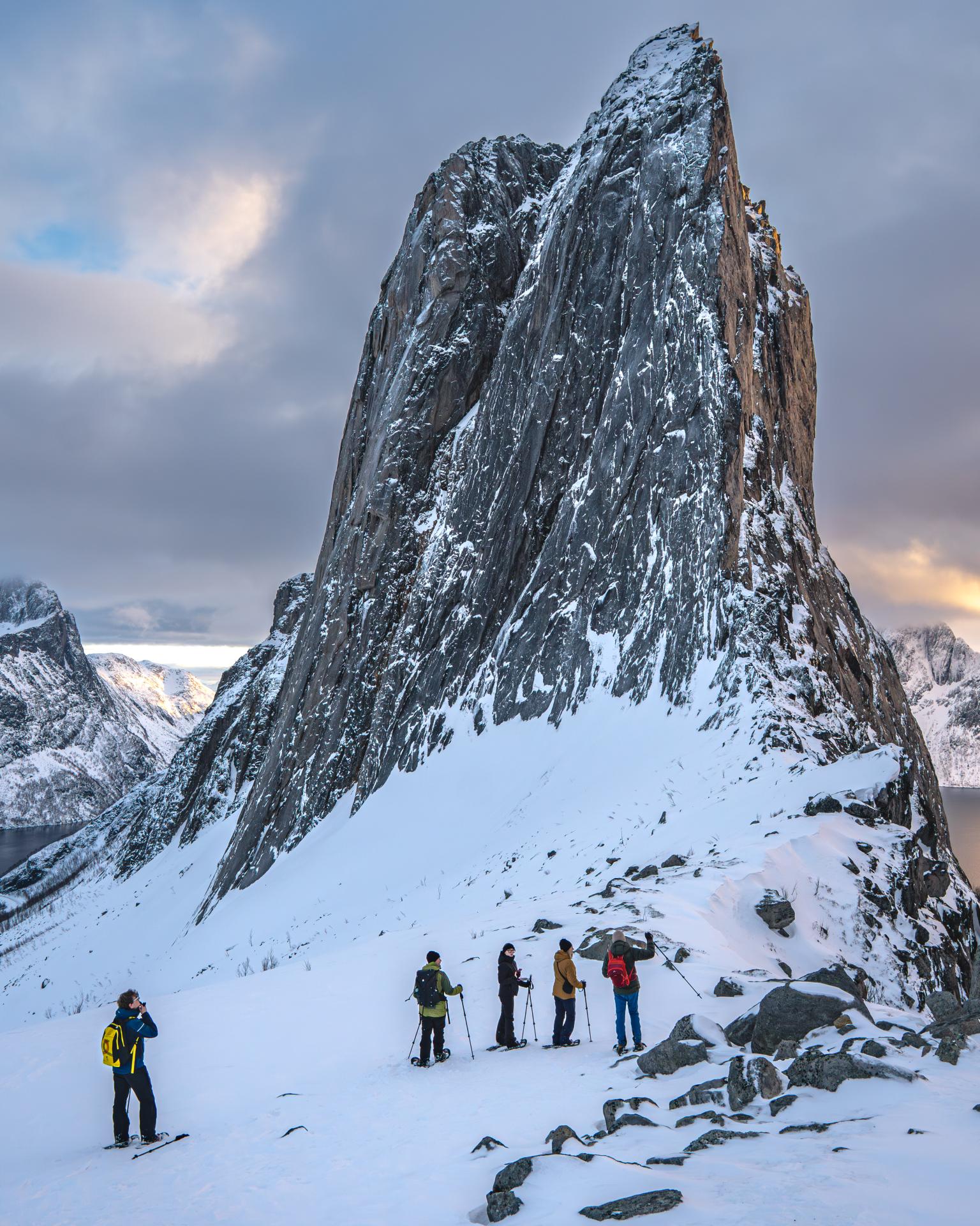 Snowshoes on Hesten is a private guided hike designed for those who want to experience Senja’s winter landscapes on foot — without technical climbing or long distances. The goal of the hike is the Segla viewpoint, one of the most spectacular viewpoints on the island, offering wide views over fjords, mountains, and the Arctic coastline.